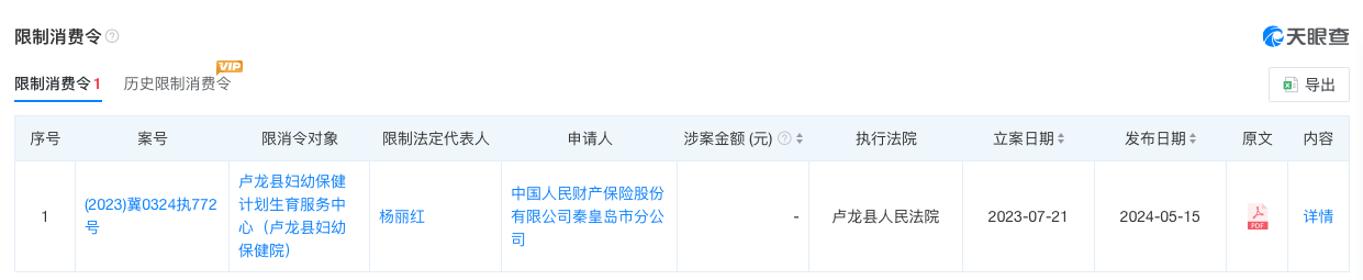 值得注意的是,卢龙县妇幼保健计划生育服务中心(卢龙县妇幼保健院)目前是被执行人,被执行总金额为12.6576万元,已被限制高消费,申请人为中国人民财产保险股份有限公司秦皇岛市分公司,执行法院为卢龙县人民法院。