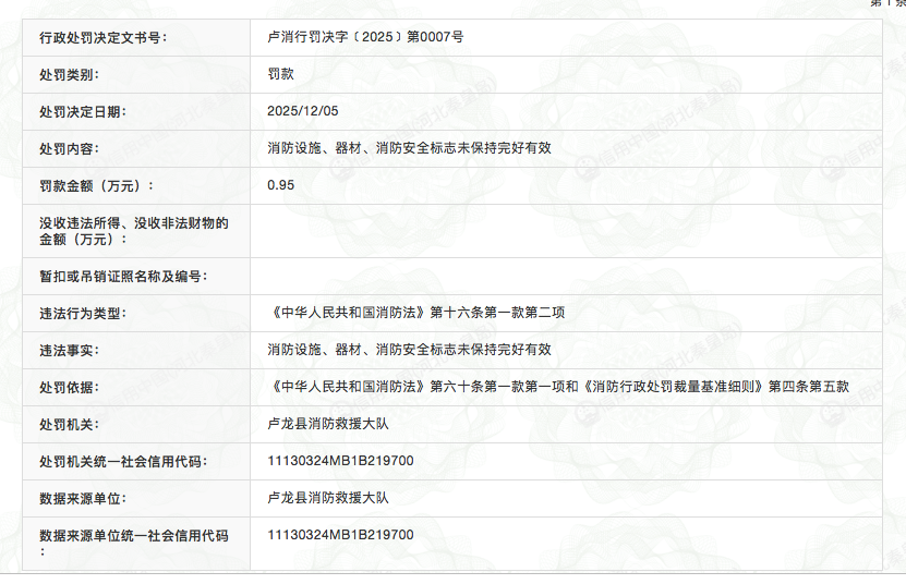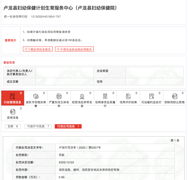 文号“卢消行罚决字﹝2025﹞第0007号”行政处罚决定书显示,卢龙县妇幼保健院违法事实为“消防设施、器材、消防安全标志未保持完好有效”,违反了《中华人民共和国消防法》第十六条第一款第二项“机关、团体、企业、事业等单位应当按照国家标准、行业标准配置消防设施、器材,设置消防安全标志,并定期组织检验、维修,确保完好有效”的规定。